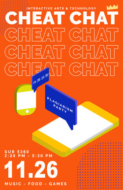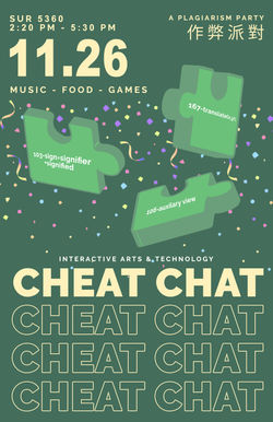 In SIAT's Design Communication and Collaboration course, my team was tasked with informing first-year students of the dangers of plagiarism by means of a poster campaign. I proposed that the team personalize the campaign to communicate the stories of the members. As the group had primarily Asian heritage as a commonality, with four of five being international students, we decided to campaign for an informative welcoming party for first-year Chinese international students in SIAT. This was done to combat the shared feeling of disconnect amongst Chinese first-year students based on the experience of the team who had just recently moved to Canada.